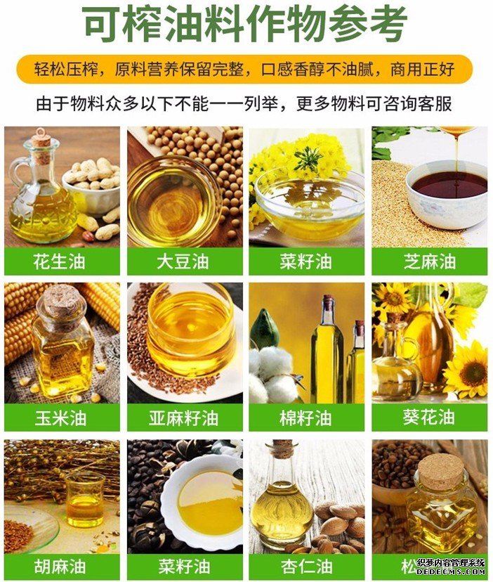 該設備可適用于菜籽、花生、茶籽、大豆、核桃、葵花籽等油料的生產(chǎn)加工,且壓榨出的油品綠色環(huán)保,對人體健康有益無害。購買此機后可長期穩(wěn)定作業(yè),對于中、小油廠和鄉(xiāng)鎮(zhèn)個體企業(yè)都很適用。
